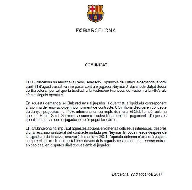 巴萨在其官方网站上写道:“巴萨因此要求球员退回该奖金,由于巴西前锋未能及时退回,需要多支付10%的滞纳金,总计935万欧元。如果球员不能支付此赔偿金,巴黎俱乐部可以替代支付。”